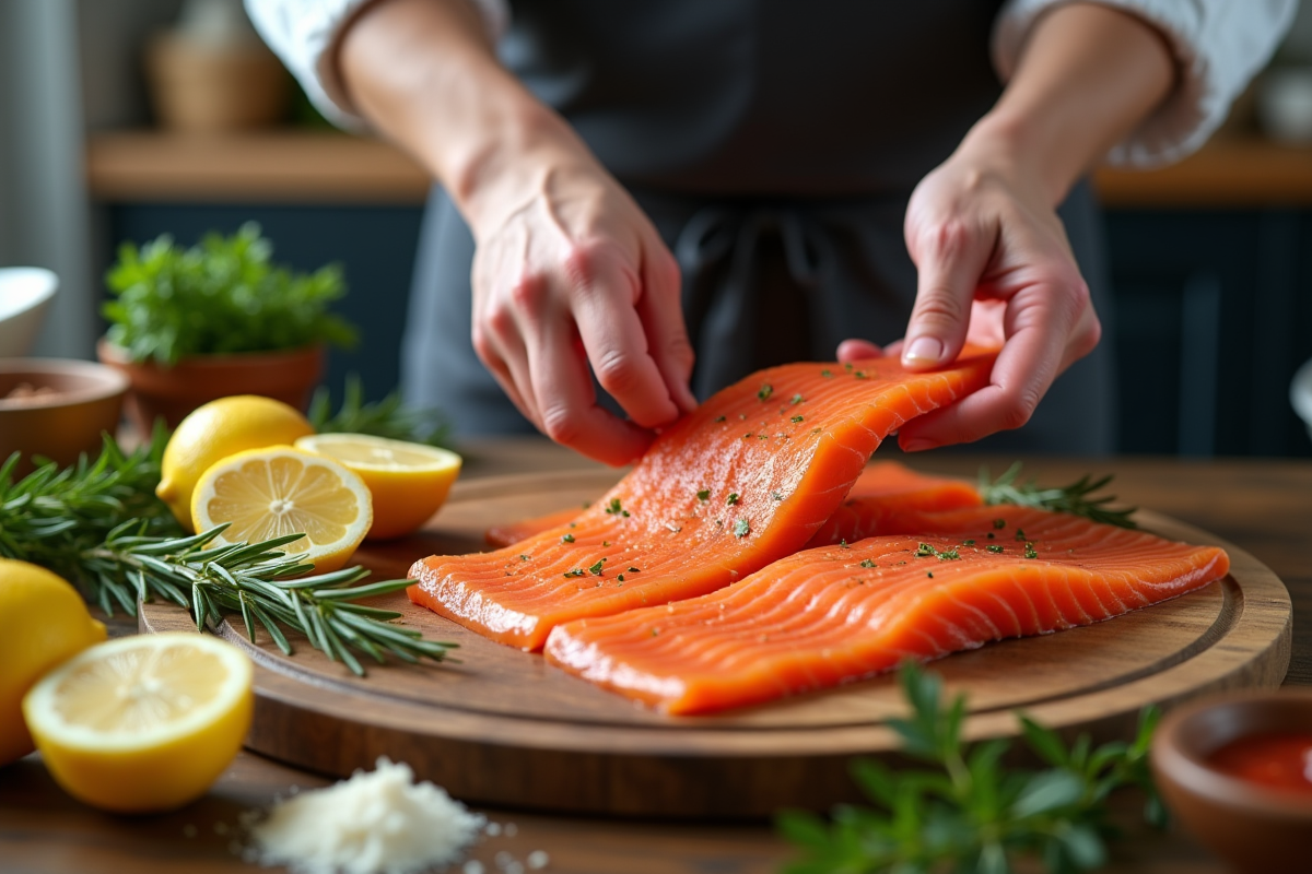 La découpe du poisson doit être réalisée avec précision. Utilisez un couteau bien aiguisé pour éviter d’abîmer la chair délicate. Pour un saumon, retirez les arêtes et la peau avant de trancher des filets d’épaisseur uniforme. Cette homogénéité permet une meilleure imprégnation des arômes lors des étapes suivantes.